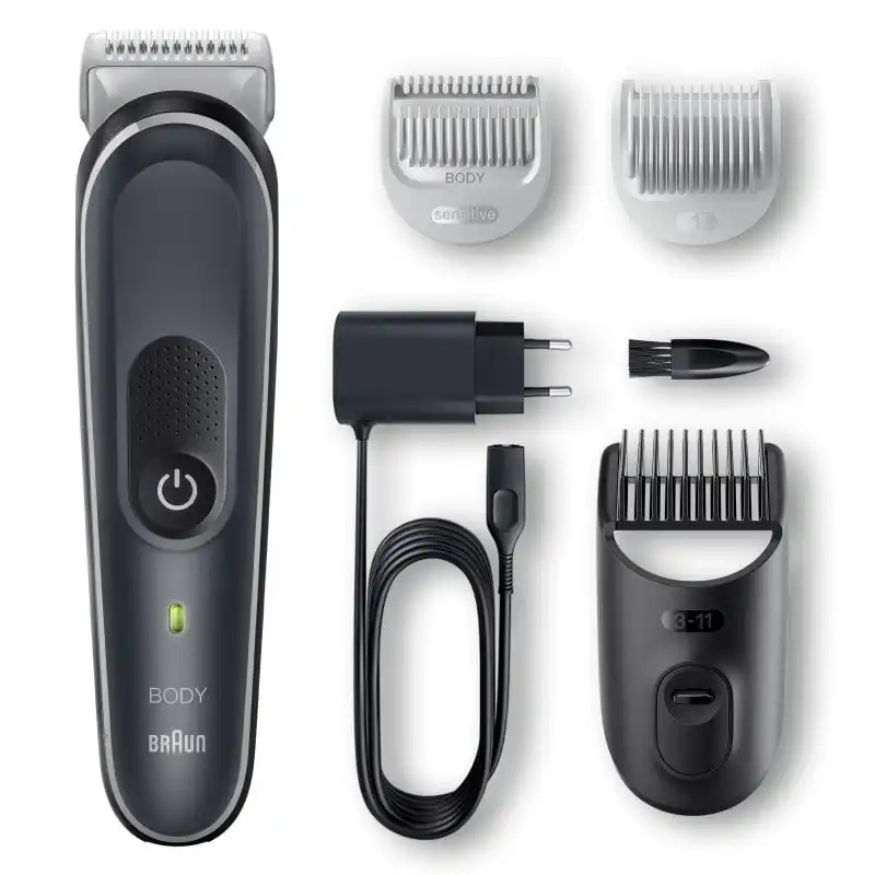 Braun recortadora corporal 5 BG 5340 afeitadora corporal masculina con tecnologìa skinshield peine para zonas sensibles lámina afilada de larga duración gris/blanco Especificaciones: Desempeño Color del producto: Negro Plata Longitud mínima del cabello: 0 5 mm Longitud máxima del cabello: 1 1 cm Suites para todo el cuerpo: Si Mojado y seco: Si Refrigeración: No Certificación: CE Ergonomía A prueba de agua: Si Lavable: Si Interruptor de encendido/apagado integrado: Si Control de energía Fuente de energía: AC/Batería Tiempo de funcionamiento: 100 min Recargable: Si Tiempo de carga: 1 h Tipo de batería: Batería integrada Tecnología de batería: Ión de litio Voltaje de la pila: 3 6 V Voltaje variable: Si Carga rápida: Si Tiempo de carga rápida: 5 min Voltaje de entrada AC: 100 - 240 V Numero de baterías soportadas: 1 Peso y dimensiones Peso: 238 g Peso de la batería: 18 6 g Contenido del embalaje Cepillo de limpieza: Si Funda para almacenamiento: Si Cargador: Si Cantidad de peines: 3 Estuche de viaje: Si Empaqueta...