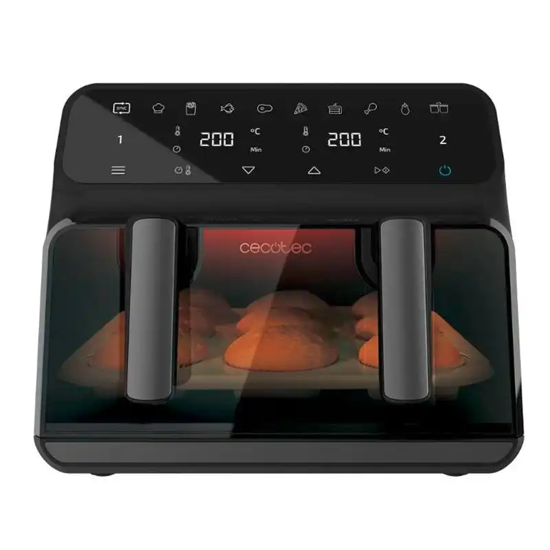 Recetas irresistibles y saludables con la freidora de aire Cecotec Cecofry Advance 9000 Window. Cocina de forma más saludable y respetando al máximo las propiedades de los alimentos. Introduce los alimentos en el cestillo, echa una cucharada de aceite, elige uno de los 6 modos preconfigurados o hazlo a tu manera, y deja que la freidora y su tecnología PerfectCook consigan sabores únicos. Cocina con una sola cucharada de aceite Prepara tus recetas prácticamente sin aceite, con una sola cucharada podrás cocinar tus elaboraciones más deliciosas. Cocina más sano y sabroso , respetando al máximo las propiedades de los alimentos. Capacidad superior Olvídate de cocinar por tandas gracias a su cubeta de 9 L que podrás utilizar al completo para una única receta o dividirla en dos cubetas de 4,5 L para preparar diferentes platos a la vez. Recetas deliciosas sin esperas Con su potencia de 2200 W podrás cocinar una gran variedad de alimentos de forma rápida y sencilla . Disfruta de tus recetas favoritas de la forma más saludable y sin esperas. PerfectCook , tecnología avanzada de aire caliente. Tierno por dentro y crujiente por fuera Consigue resultados excepcionales con esta tecnología de aire caliente. Introduce los alimentos dentro del cestillo, programa los ajustes y la freidora hará el resto para que disfrutes el doble . Temperatura regulable, recetas a tu gusto , Gracias a su termostato podrás regular la temperatura entre 60 y 200 grados para poder cocinar infinidad de elaboraciones y conseguir el punto deseado. , Panel de control táctil multifunción La freidora dietética cuenta con un diseño moderno y compacto con un panel de control táctil multifunción para tener el control total en cada elaboración de la forma más cómoda y rápida . Olvídate de controlar tiempos y temperaturas Escoge uno de sus 6 modos preconfigurados que establecen el tiempo y la temperatura necesarios de forma automática para que no te tengas que preocupar por nada. , Cocción dual , Cocina una o dos recetas al mismo tiempo gracias a la posibilidad de dividir su cubeta de 9 L en dos cubetas de 4,5 L de capacidad . , Ventana: Mira a través Valora en todo momento la cocción de tus recetas a través de la ventana de visualización de tu Cecofry y no desperdicies ni un grado de temperatura .