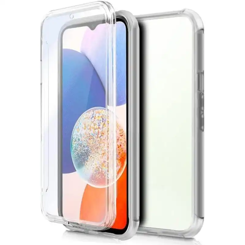Funda resistente para Samsung A145 Galaxy A14 / A14 5G de tipo transparente silicona semirígida 360º cubre parte frontal y trasera del smartphone. Nada podrá destruir tu smartphone ni caídas ni golpes ni arañazos... tanto la pantalla frontal de tu móvil como las partes laterales y trasera del mismo quedarán perfectamente cubiertas y protegidas con la funda 3D marca COOL. Importante para Smartphones con reconocimiento de huella dactilar se deberá grabar la huella dactilar de nuevo una vez puesta la funda.