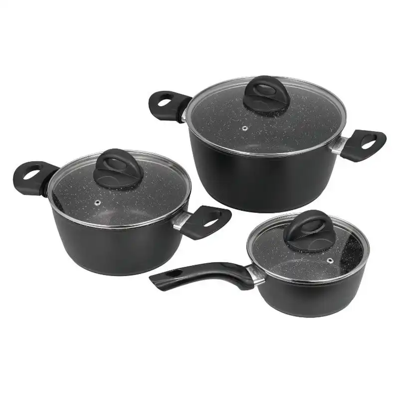 Batería de cocina Jata de 3 piezas con tapas. Fondo difusor inducción total y base sandwich de 3 mm para mantenimiento control y difusión perfecta del calor. Características: Fondo difusor inducción total. Recubrimiento antiadherente ?Stonite? Xylan Plus the Whitford libre de PFOA. Cuerpo de aluminio forjado. Base sandwich de 3 mm para mantenimiento control y difusión perfecta del calor. Válidas para todo tipo de cocinas incluida inducción. Especificaciones Jata BC3: 3 piezas: Cazuela de 24 cm. con tapa Altura 12 cm. Capacidad 4 2 L. Cazuela de 20 cm. con tapa. Altura 9 5 cm. Capacidad 2 4 L. Cazo de 16 cm. Altura 7 cm. Capacidad 1 1 L.