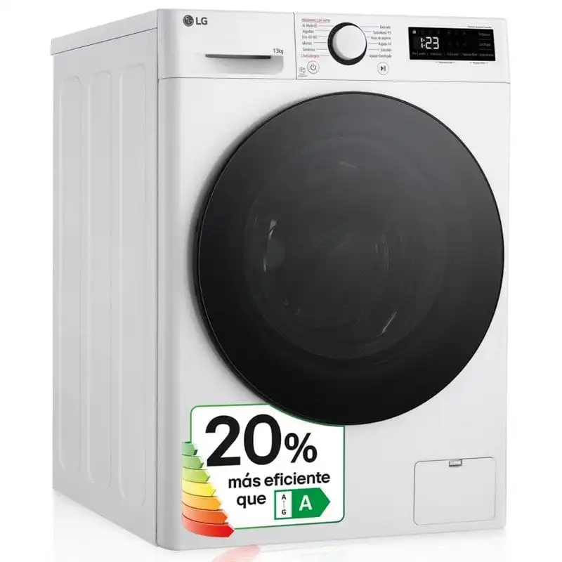 Conoce más acerca de la etiqueta de eficiencia energética o información del productoLavadora inteligente F4WR6013AGW de la Serie 600 de LG con tecnologías AI Direct Drive y TurboWash 360º Vapor una capacidad de 13 kg velocidad de centrifugado máxima de 1400 rpm y un 20% más eficiente que la clase de eficiencia A. 20% más eficiente que A La forma más inteligente de ahorrar. Lava y cuida tu ropa mientras ahorras energía. Gran capacidad: Más capacidad ocupando lo mismo Lava hasta 2 kg más de ropa en cada colada. Tambor más grande en una lavadora con las mismas dimensiones. Lavadora con Inteligencia Artificial: Reduce el desgaste de tu ropa El motor AI DD™ detecta las características de los tejidos introducidos en la lavadora y establece los movimientos óptimos del tambor para un mayor cuidado de la ropa. TurboWash™360°: Lava en profundidad en tan solo 39 minutos Tu colada estará lista en 39 minutos reduciendo el desgaste en tu ropa. Los 4 sprays de agua cubren los 360º del tambor. Steam™: Higiene y cuidado de tu...