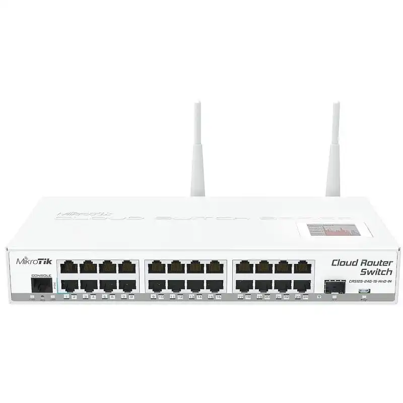 Cloud Router Switch es nuestra nueva serie de Smart Switch. Combina las mejores características de un router completamente funcional y un conmutador de capa 3 es impulsado por el conocido RouterOS. Todas las opciones específicas de configuración del conmutador están disponibles en un menú de conmutador especial pero si lo desea los puertos pueden eliminarse de la configuración del conmutador y utilizarse con fines de enrutamiento. Además este dispositivo tiene un punto de acceso inalámbrico de 2 4 GHz integrado lo que significa que puede tener un AP un enrutador con cualquier número de puertos y un interruptor inteligente de velocidad de cable completa todo en un dispositivo ideal para empresas medianas y pequeñas. y oficinas. Tiene 24 puertos Gigabit uno SFP un puerto microUSB y un AP inalámbrico integrado. Especificaciones Conexión WAN Ethernet WAN: Si Características de LAN inalámbrico Banda Wi-Fi: Doble banda (2 4 GHz / 5 GHz) Estándar Wi-Fi: Wi-Fi 4 (802.11n) Wi-Fi estándares: 802.11b 802.11g Wi-Fi 4 (80...