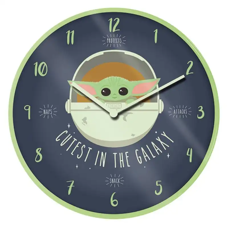 El reloj de pared de la marca Pyramid cuenta con un diámetro de 25cm. Se entrega en una caja de cartón abierta por el frontal y cubierta por film transparente. Especificaciones: Tipo: Reloj Diseño: Cutest In The Galaxy Diámetro: 25 cm. Material: Plástico Sintético Funcionamiento: 1 pila AA (no incluida). Licencia oficial: Star Wars The Mandalorian.