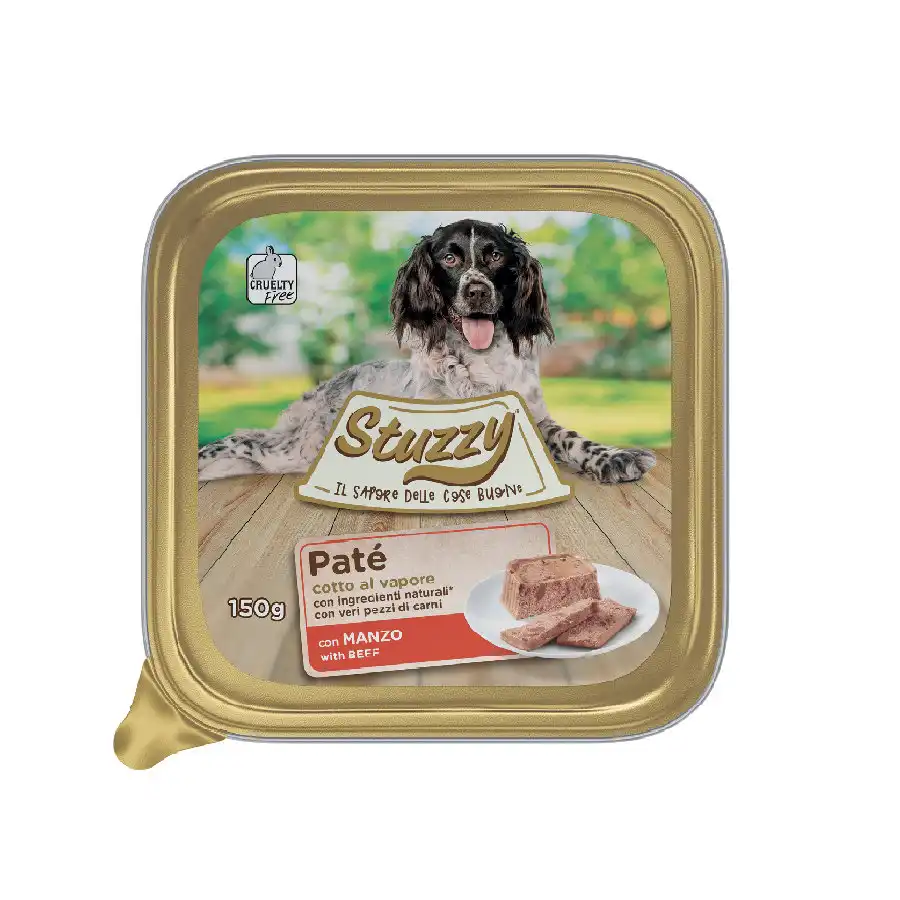 Paté para perros Mister Stuzzy Dog calidad extra con mucha carne Mister Stuzzy Dog es un paté completo, equilibrado y jugoso elaborado con ingredientes naturales de primera calidad que encantará a tu mascota. Cada lata constituye un alimento muy nutritivo y sabroso. La forma de cocinar cada ración es al vapor, gracias a ello, sus cualidades nutricionales y sabor se mantienen intactos. Al incorporar ingredientes como pato, jabalí, pollo, conejo, pavo, cordero, salmón y trucha aporta un sabor delicioso, lo que hará que este alimento sea irresistible para tu mascota. Además, gracias a su composición y preparación, el paté propicia una buena digestión. Por ello, es un alimento ideal para perros con poco apetito o convalecientes. La receta tiene como base animales alimentados con ingredientes naturales, sin antibióticos ni anabolizantes. Puede tratarse tanto como alimento completo como suplemento de la dieta de tu mascota. VENTAJAS: Comida húmeda elaborada con ingredientes naturales de primera calidad. Recomendable para perros convalecientes o con poco apetito. Fácil digestión y sabor irresistible. No incluye colorantes ni conservantes. Envasado con sistema abrefácil. USO Y ESPECIFICACIONES: Paté sabroso ideal para cualquier perro, especialmente para aquellos con poco apetito o convalecientes. Multitud de variedades: pato, jabalí, pollo, buey, pavo, cordero, jamón, salmón, trucha. Descripción nutricional: Ingredientes: carnes y subproductos animales 65% (carne de vaca 16%), subproductos de origen vegetal, sustancias minerales. Constituyentes analíticos y Kcal/kg: Proteína 9% , fibras brutas 0.4%, contenido de grasa 5%, ceniza bruta 2%, humedad 82%, 84 Kcal/100g. Aditivos nutricionales/kg: Vit. D3 80 U.I., Vit. E 80 mg, sulfato de zinc monohidratado 55 mg, sulfato manganoso monohidratado 9.2 mg. Dosificación: Puede usarse como alimento único o complemento de la dieta. Sirve a diario el alimento a temperatura ambiente. Se debe conservar en el frigorífico durante las siguientes 24-48 horas de abrirlo. Deja siempre agua limpia y fresca a disposición del animal. Las cantidades de ración diaria son orientativas. Se han de tener en cuenta las características de cada perro. PESO DEL PERRO CANTIDAD DIARIA LATAS AL DÍA 1-4 kg 150-300 g ½ -1 4-8 kg 300-450 g 1-1 ½ 8-12 kg 450-600 g 1 ½- 2 12-15 kg 600-750 g 2-2 ½ Formato: Envase de 300 g Alimenta a tu mascota con Mister Stuzzy Dog Paté, un producto de calidad excepcional y un sabor irresistible. A partir de la fecha en que recibas tu producto, se garantiza un plazo de 3 meses antes del vencimiento de su fecha de caducidad, o de 1 mes en el caso de los productos lácteos y el pienso ecológico.