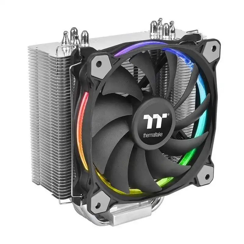 Diseñado para entusiastas y jugadores de PC Thermaltake Riing Silent 12 RGB Sync Edition es un ventilador de CPU potente y silencioso que cuenta con aletas de aluminio de 0 4 mm de espesor y 4 tubos de calor de contacto directo para una disipación efectiva del calor. El ventilador PWM de 120 mm integrado viene con un diseño de alto flujo de aire y un anillo LED patentado de 256 colores que se controla directamente mediante el software RGB de la placa base incluido ASUS Aura Sync ASRock RGB LED BIOSTAR Vivid LED DJ GIGABYTE RGB Fusion y MSI Mystic Light Sync. Riing Silent 12 RGB es compatible con todos los zócalos de CPU Intel y AMD más recientes y te ofrece un excelente enfriamiento y un rendimiento silencioso. Características: Diseño LED patentado. El anillo LED incorporado presenta una excelente cobertura de luz color y brillo uniformes y es compatible con el software RGB de la placa base seleccionada (ASUS ASRocK BIOSTAR GIGABYTE y MSI). Sincronizar con la placa base RGB Software. Diseñado para sincroniza...
